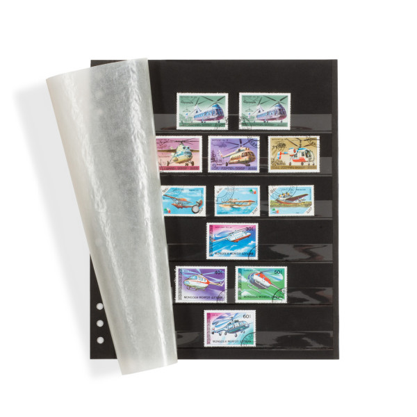 Insert stock sheets for creating individual stamp collections. Made of sturdy black carton with 6 clear strips. Double ?tment front and back side. With linen hinge and double protective sheet (glassine). Suitable for GRANDE binders and postbound DSN. Overall size: 252 x 303 mm (10 x 12“).