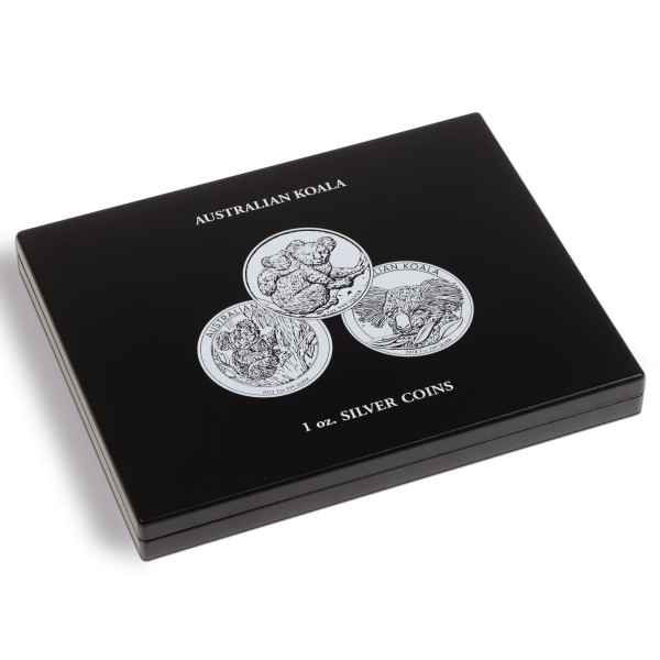 Elegant black presentation case to house 20 silver Koala coins (1 oz. edition) in original capsules. One tray featuring a mock black surface and 20 circular ports (diameter 45,4 mm / 1 3/4"). Silver-coloured printing on lid and cushion with Koala designs. The lid cushion is covered in black satin and features a secure and unobtrusive magnetic lock. Overall size: 305 x 30 x 245 mm (12 x 1 1/4 x 9 5/8").