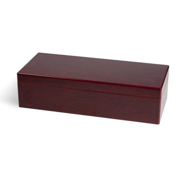 Molded insert covered in soft dark-blue velour. Suitable for most certified coin holders (PCGS, NGC, ANACS, ICG, etc.) up to 60 x85 mm. Mahogany-stained wood, solid construction, gold-plated hinges, secure magnetic closure. Double row with moulded coin inserts lined in dark blue velour. Overall size: 374 x 158 x 98 mm (14 3 / 4 x 6 1 / 4 x 3 9 / 10 ").