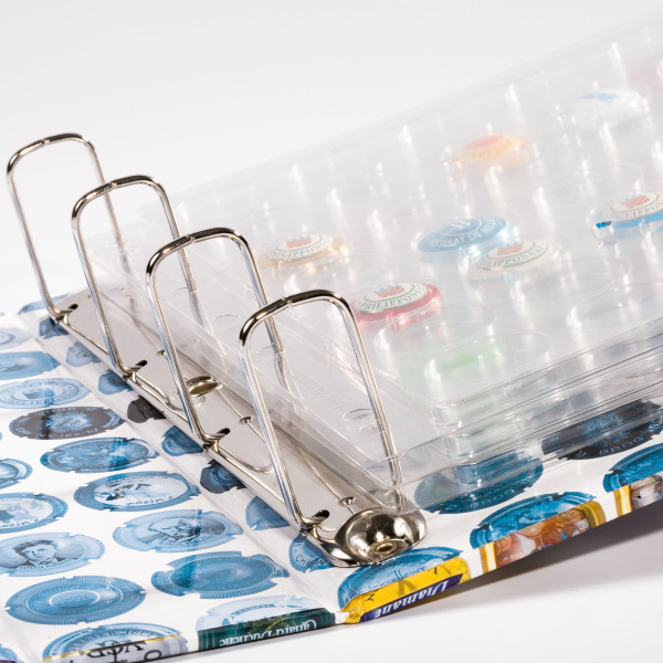 5 transparent COMPART 42 plastic sheets, each one houses 42 champagne caps/bottle caps. Easy to use: simply slide the champagne caps/bottle caps into the compartments from behind. Includes 5 black interleaves to protect your collection. Suitable for use with all GRANDE binders. Overall size: 240 x 296 mm (9 1/2 x 11 5/8").