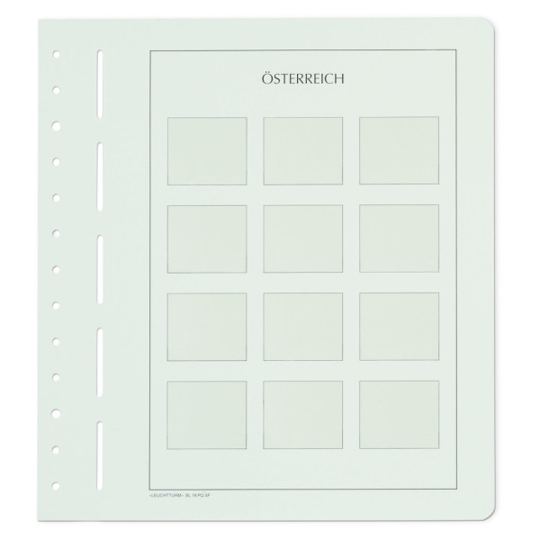 Format:Landscape format We offer special LIGHTHOUSE blank album pages (12 neutral fields with SF mounts per page, 100 % polystyrene) to store the Austrian personalised stamps which are available since November 2003. Compatible with LIGHTHOUSE ring, turn-bar and springback binders, 13 punched holes.