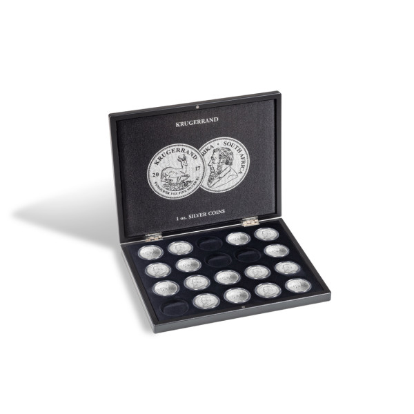 Elegant black presentation case for collecting 20 Krugerrand silver coins (1 oz.) in LEUCHTTURM capsules (GRIPS 39). 1 tray featuring a black velour surface and 20 round cavities (Ø 45 mm / 1 ¾"). Silver-colored printing on lid and cushion with coin design. Lid cushion is up-holstered in black satin. Secure and unobtrusive magnetic lock. Overall size: 305 x 30 x 245 mm (12 x 1 ¼ x 9 ?"). Capsules are not included.