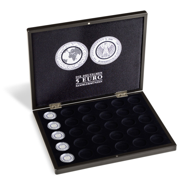 One for all: High-quality, black presentation case to hold 5 German 5-euro collector coins “Planet Earth” as well as 25 German 5-euro collector coins from “The Earth’s climate zones” series (minting letters A, D, F,