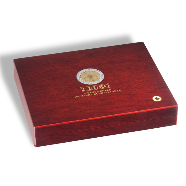 Hiigh-quality VOLTERRA TRIO de Luxe presentation case feature a premium mahogany wood grain finish for all 80 2-euro commemorative coins from the series "German Federal States" in capsules.