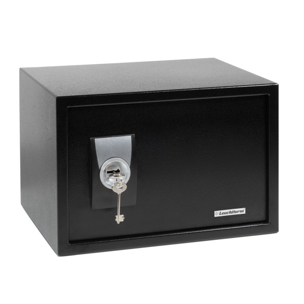 Protect your valuables against theft or unauthorized access with the LEUCHTTURM KAVENT safe. The safe’s walls are made of 2 mm-thick steel and its door is made of 4 mm steel. The safe is locked by means of a two-way key and 2 solid steel bolts. Thanks to its specially sized interior, the safe is large enough to store office ring binders (A4 size), 3 GRANDE ring binders (incl. slipcase), 7 NUMIS ring binders (incl. slipcase; upright), 13 MB coin drawers, 8 VOLTERRA UNO wooden coin drawers, stockbooks, PERFECT turn-bar binders, LUXUS springback binders, EXCELLENT ring binders and lots more. A soft felt mat on the inside base prevents your valuables from getting scratched. Two screw holes are located on the back as well as the base of the safe, meaning that the safe can be affixed to a wall or wardrobe wall or to the ground or to the shelf floor (fittings included). 2 two-way keys, each with a separate key number that is unique to the integrated lock are included in the package. Weight: 13.5 kg. Size of door opening: 355 x 240 mm / 14 x 9 1/2" (L x H). Interior space*: 425 x 290 x 340 mm / 16 3/4 x 11 3/8 x 13 3/8" (L x H x D). Overall size: 430 x 295 x 360 mm / 17 x 11 5/8 x 14 1/8" (L x H x D). *Please note that the inner dimensions are different in the area of the door hinges and in the area of the lock: The depth in the area of the door hinges, with the door opened, is 313 mm (12 3/8"). The depth in the area of the lock, with the door closed, is 300 mm (11 7/8").
